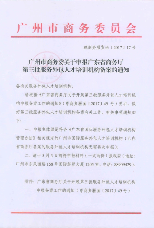 转发:广州市商务委关于申报广东省商务厅第三批服务外包人才培训机构备案的通知