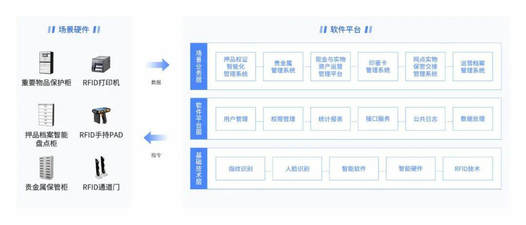 广电运通基于对银行实物运营管理中的问题和痛点分析,创新开发开出“银行实物运营数字化管理平台”软件平台。该平台研发集成重要物品保管柜、权证押品档案自动盘点柜、贵金属保管柜等多款智能场景硬件,为银行权证押品管理、印鉴卡管理、贵金属管理、运营档案管理、现金尾箱出入库管理、网点重要物品管理等运营管理场景提供软硬件一体的数字化解决方案。