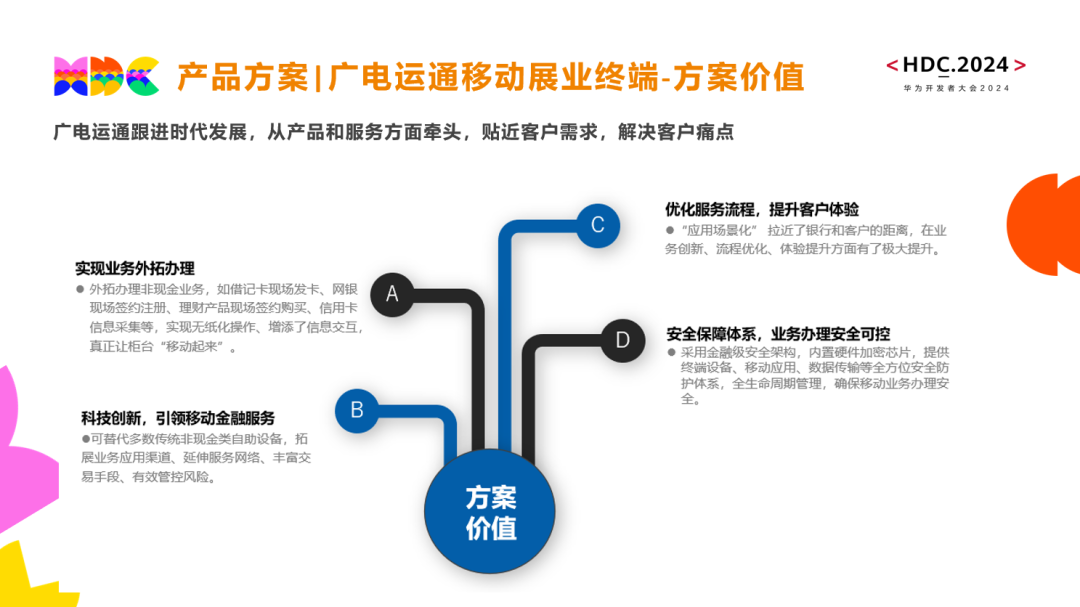 近日,备受瞩目的华为开发者大会(HDC 2024)在东莞松山湖盛大举行,广电运通作为鸿蒙生态在金融行业的产业伙伴,携创新产品和解决方案重磅亮相,成功吸引了众多与会者的关注,不仅彰显了广电运通在鸿蒙生态的技术实力和专业能力,更进一步证实了鸿蒙生态在金融行业应用的广阔前景和无限潜力。